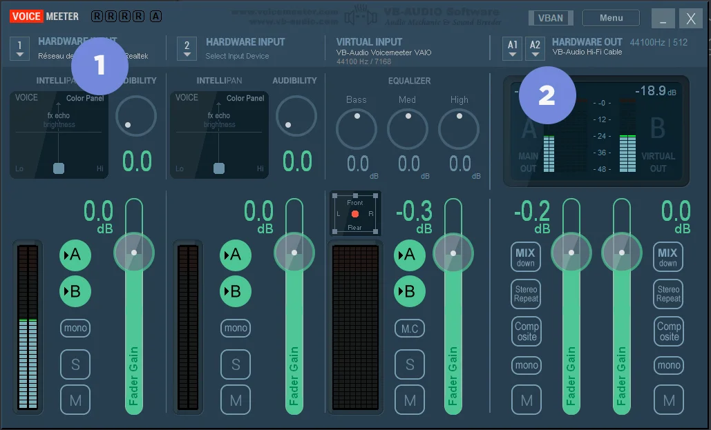 In order for VoiceMeeter to be fully up to date you will also need to download 2 software programs: VB-Cable & Hifi-Cable & Asio-Bridge. Once these 2 software are downloaded, unzip the archive, open the folder and run it, then click on Install. Repeat the manipulation for the second software. Once this is done, finally open VoiceMeeter, it should look like this: