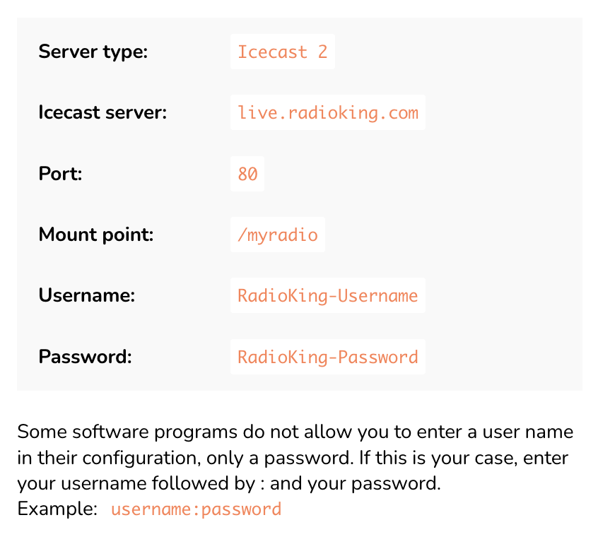 Simply enter the information into the corresponding areas of your software (username, mount point, port, Radio Manager password…)