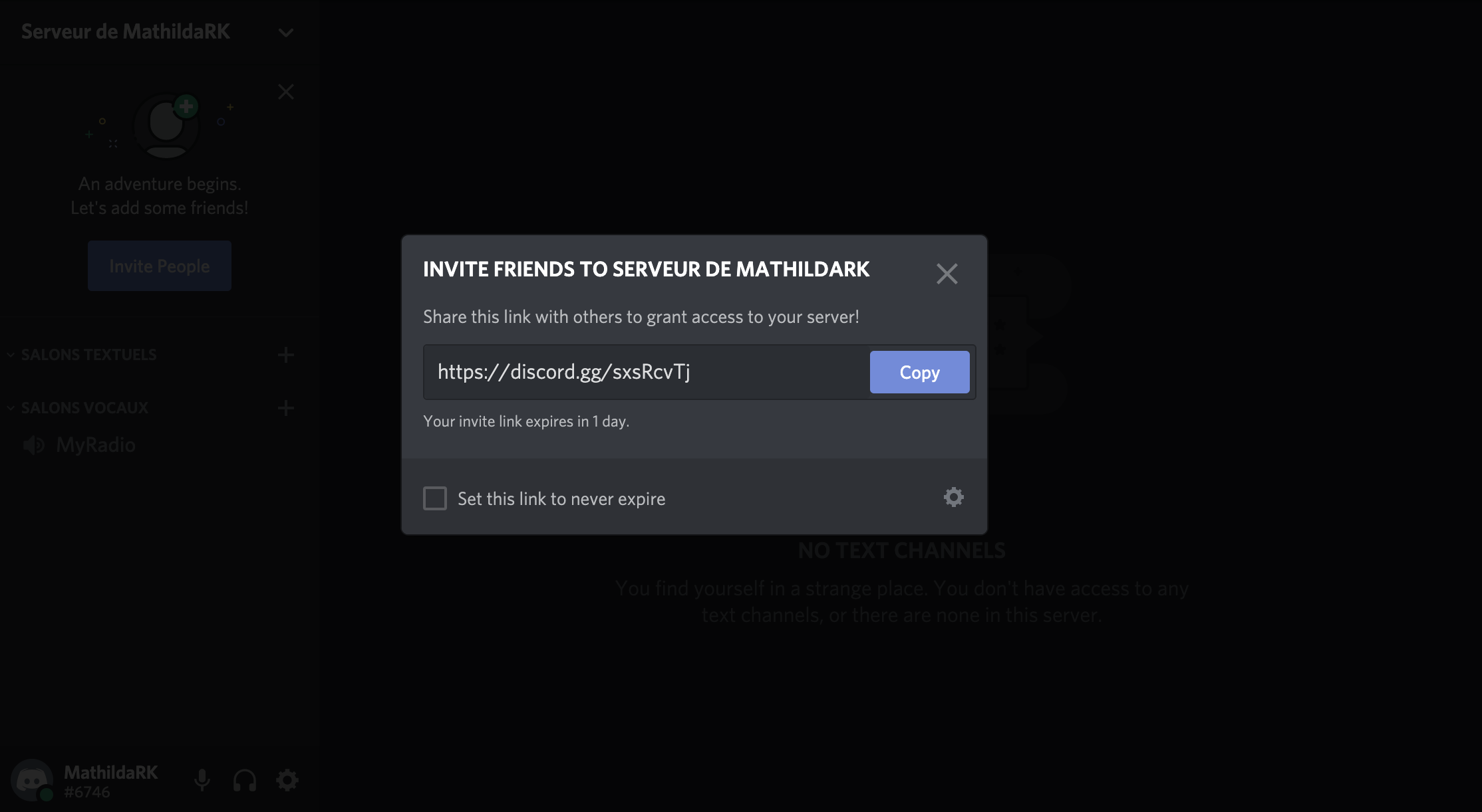 - As soon as your voice channel is ready, click on the Create Invite button next to your channel name to retrieve a temporary invitation link or to directly add an account to join you.