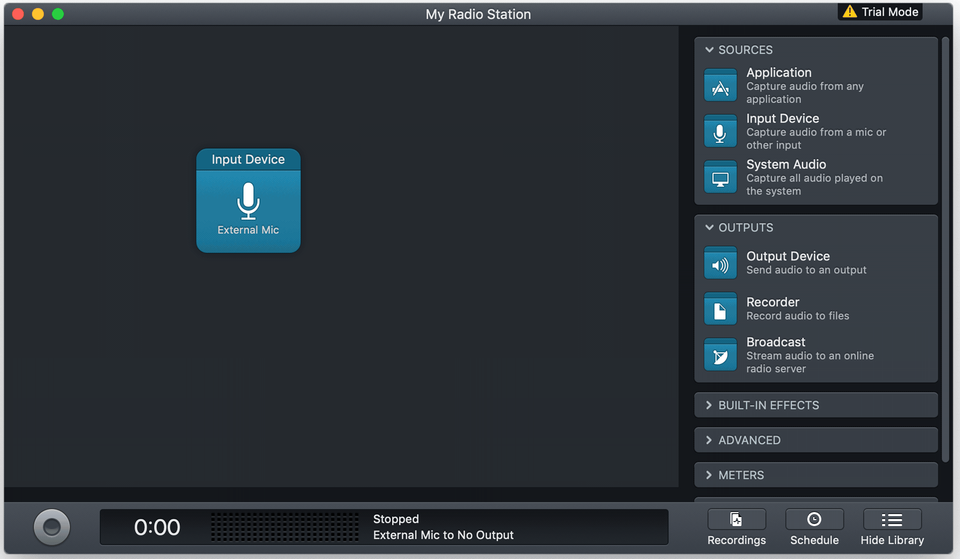 We’re now going to configure our input device. To do so, simply drag and drop the Input Device block from the sources area, and select the microphone you want to use. If you don’t have a microphone, you can use the internal mic on your computer.