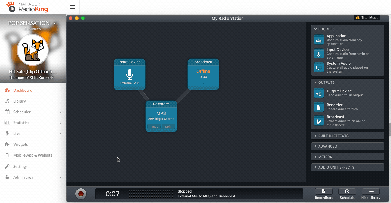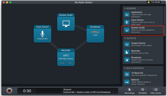 Audio Hijack includes many other features that you can test and play around with. For example, if you insert a System Audio block, you’ll be able to broadcast any sound coming from your computer (YouTube, iTunes etc…)
