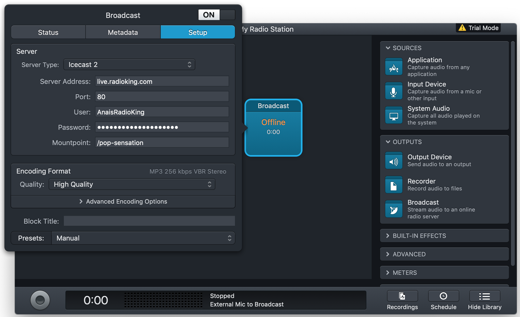 Click on the Broadcast block and head over to the setup tab. Here, you can enter in your connection information. If you’re a RadioKing client, you’ll find this information under the Live Tab of your Radio Manager.