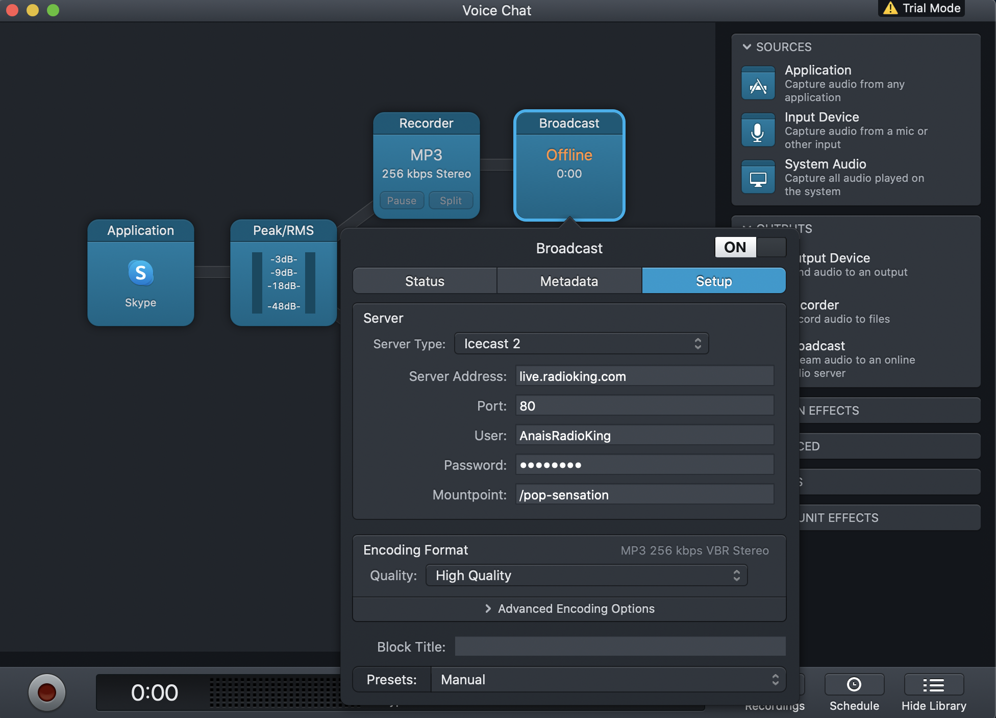 Configure your radio station by dragging in the broadcast block and attaching it to the recorder block. Click on the block and go to the setup tab in order to enter your live connection information.
