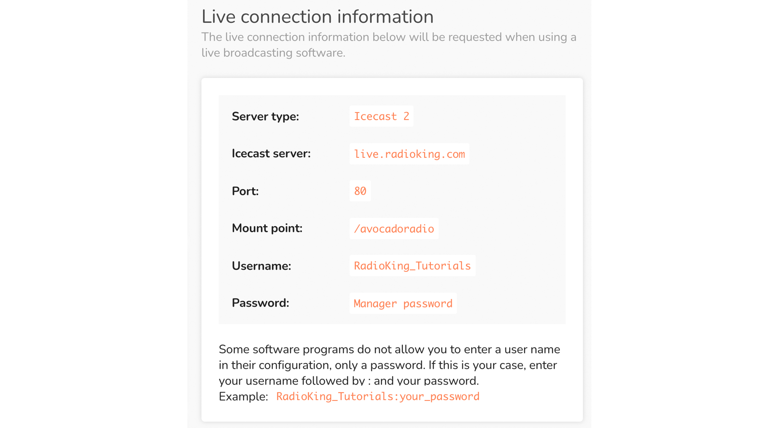You will then need to update all fields with your login information. All the necessary information is available under the Live Tab of your Radio Manager.