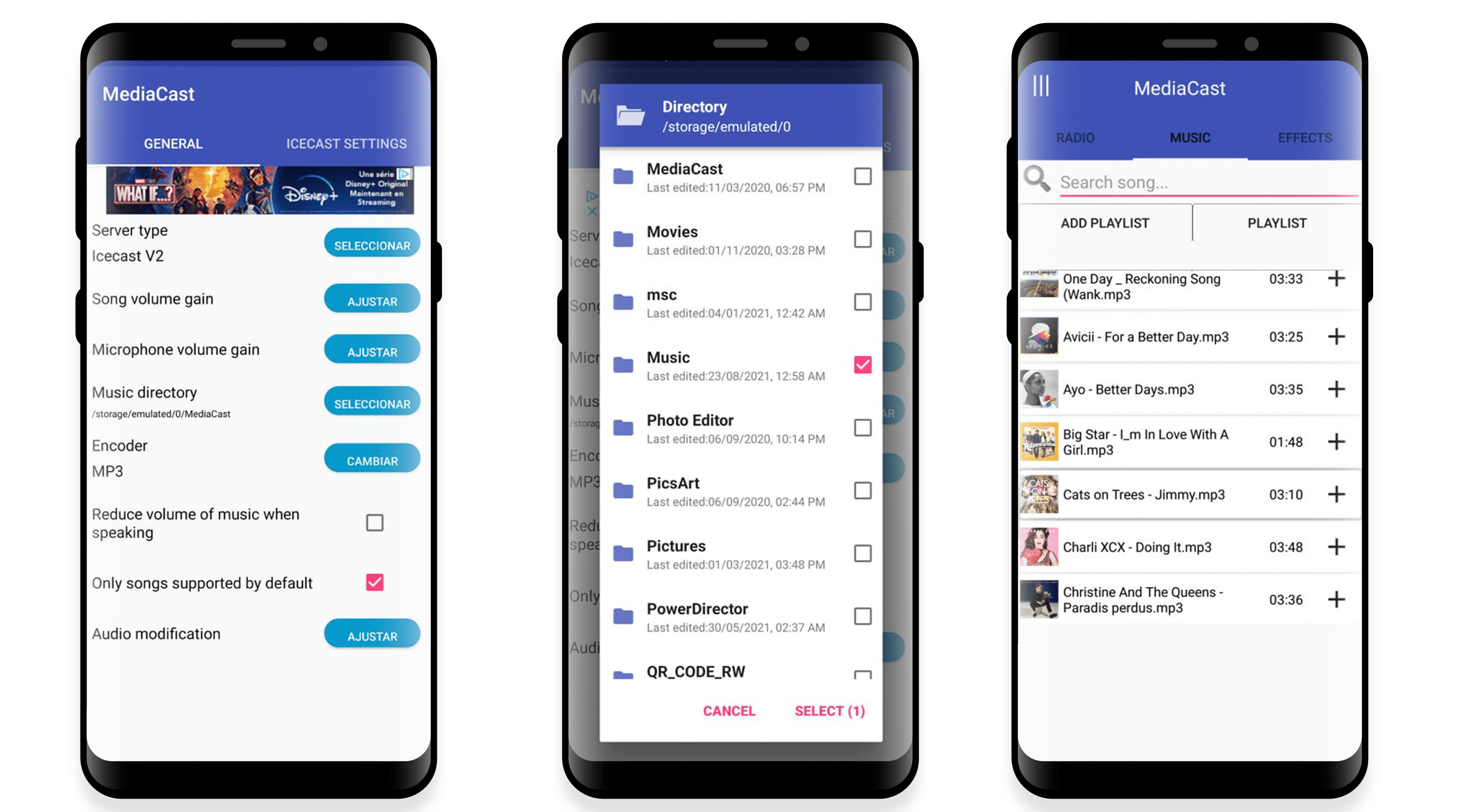 To add your tracks to MediaCast, simply head over to Settings > General > Music directory and choose the folder that contains all your music. Then go to the Music tab to choose your desired tracks!