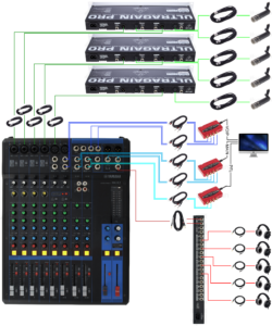 Green: This corresponds to the microphones. Each microphone goes into an amp (up to 2 microphones per amp), which is used to increase the volume of the microphone and for pre-processing. The output of the amp goes to the mixing desk.