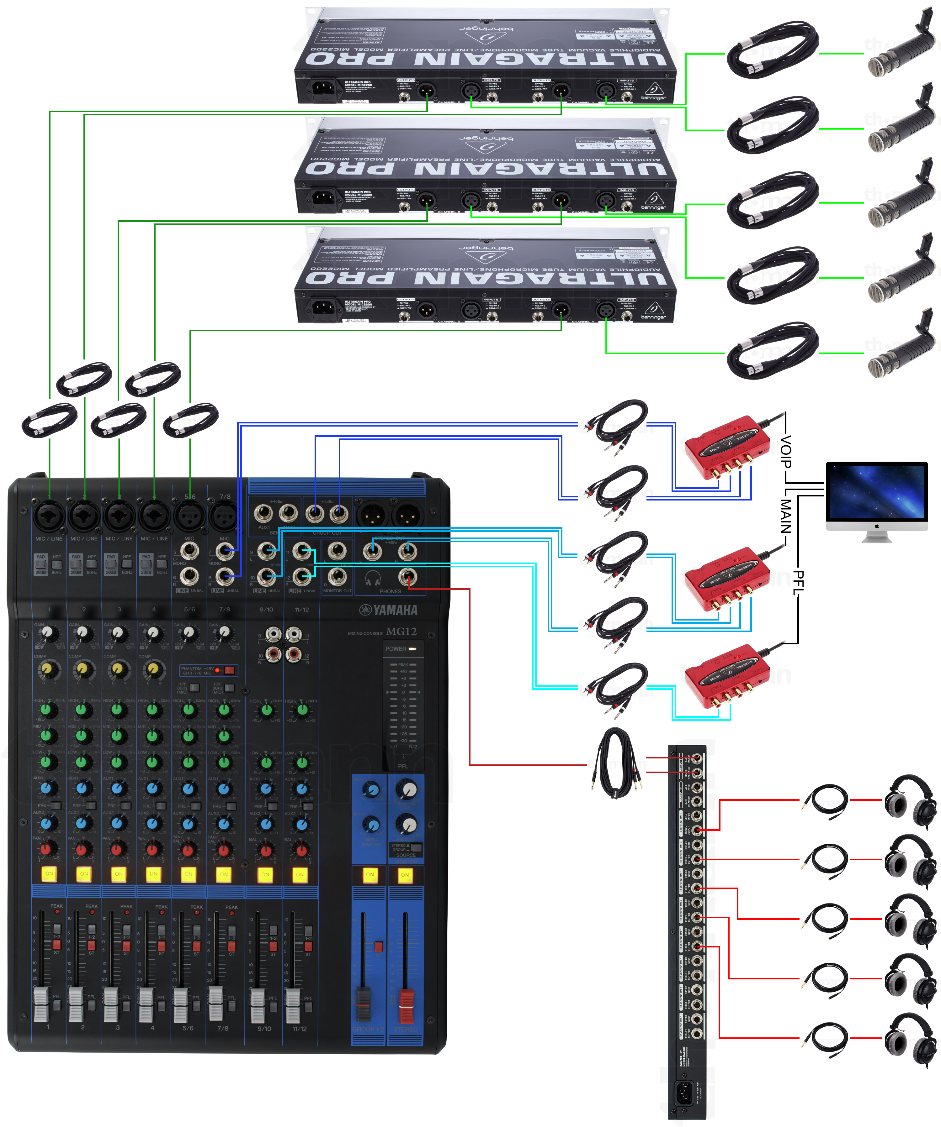 Red: This section corresponds to headphones. The “PHONES” output of the mixing table goes to a headphone amp. It’s used to amplify the output and distribute it to up to 8 headphones (5 in our case).