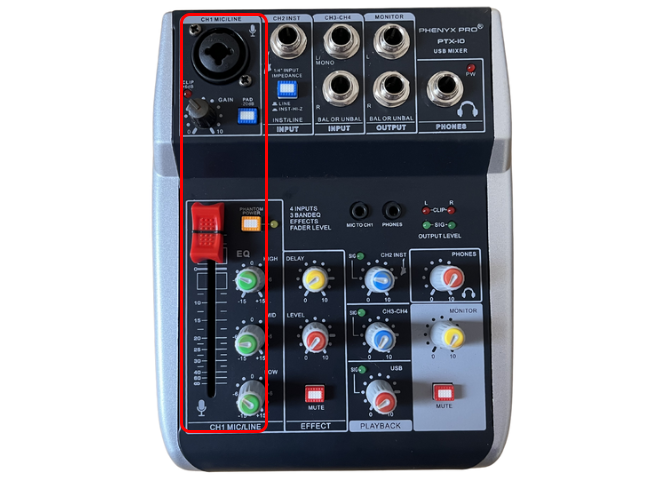 There’s a total of 4 channels on this audio mixer, we’re going to take a look at each one and the various features that go with them.