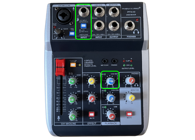 Next to the second headphone jack, you’ll find a Mic to Channel 1 input. If you choose to use this input, it will be controlled with the same knobs as channel 1. Essentially, it will be on the same input at the XLR microphone channel.