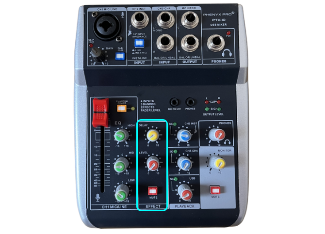 It’s rare for an audio mixer of this size to have any effects on it, but here we have a delay effect that will essentially add an echo to your voice. This feature may not be useful to everyone, but as a radio host, it could be fun to play around with!