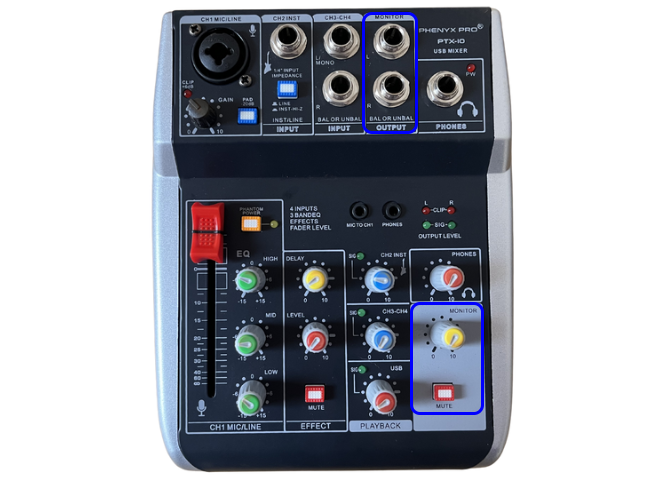 You’ll find a monitor control knob to adjust the volume, as well as a mute button so that you can easily disable the sound from that channel.