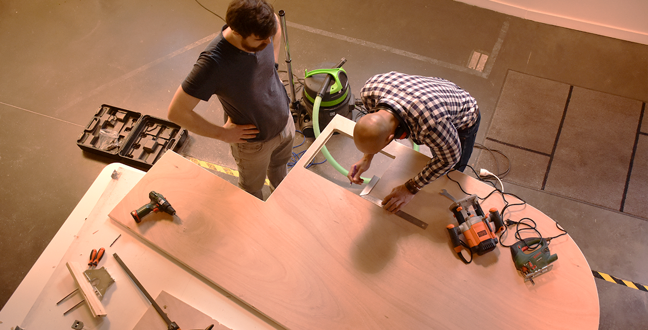 Then we moved on to the hole for the mixing desk. We measured it and decided where we wanted it to be placed in the table and again we used the router. We checked if the mixer fitted well, we had to go back with the router and take a bit more off the edges to make it perfect!”
