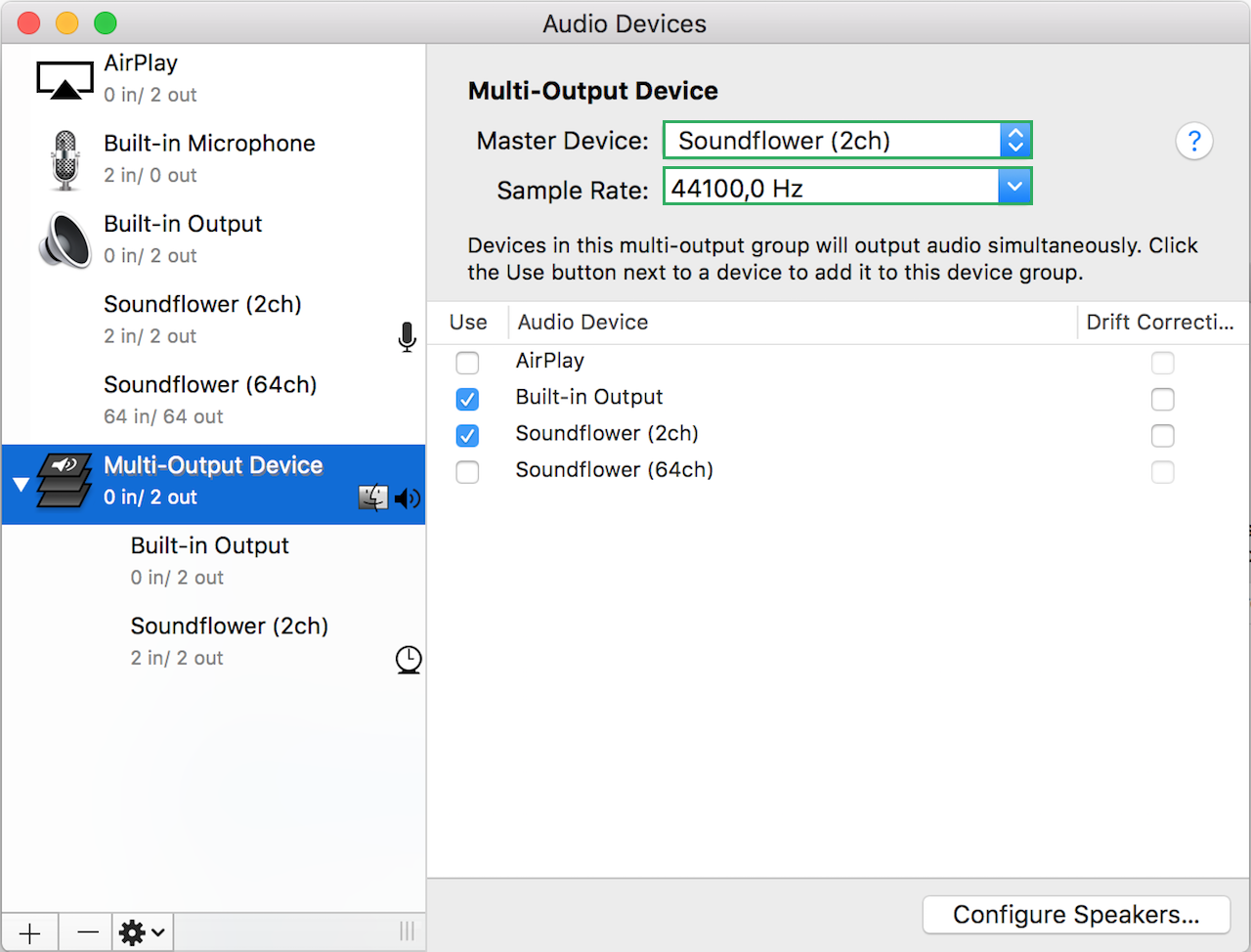 Ensure that your settings are as shown below for Master Device and Sample Rate. Your Audio Devices in use should be Soundflower (2ch) and your earphones/headphones (in our case, Built-in Output):