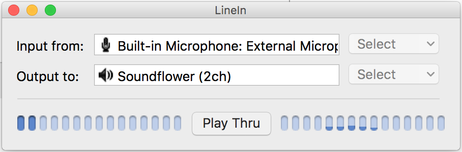 Select Soundflower (2ch) as your Output before clicking on Play Thru.