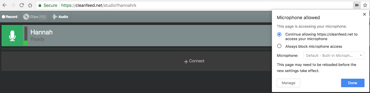 If you’re using an external mic, you’ll need to select it by clicking on the video camera in the browser address bar and then on Manage:
