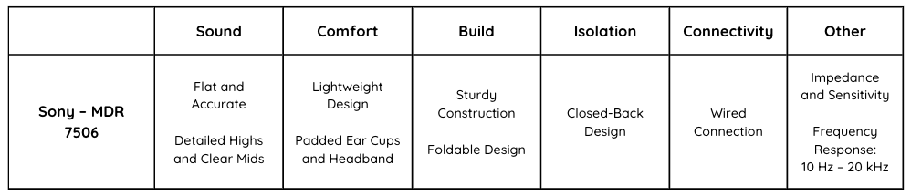 – Impedance and Sensitivity: With an impedance of 63 ohms and high sensitivity, the MDR-7506 headphones are compatible with a wide range of audio equipment, from professional studio gear to portable devices.