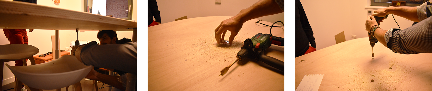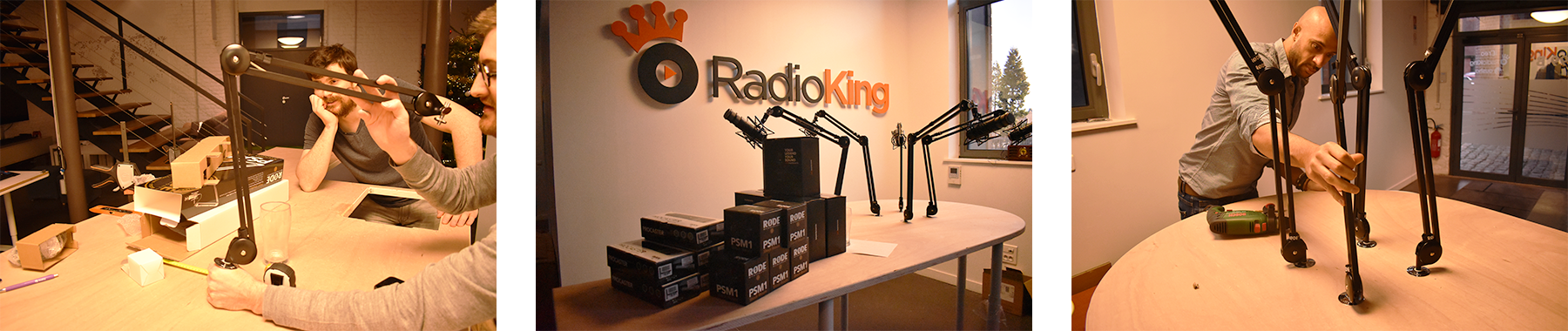Our table is now standing on it’s own! Teddy and Guillaume then drilled 5 holes (from above and under the table) for our microphone arms. If you’re interested, we purchased the Rode PSA-1 table microphone arms. We’ll also be using the Rode PSM1 shock mounts.