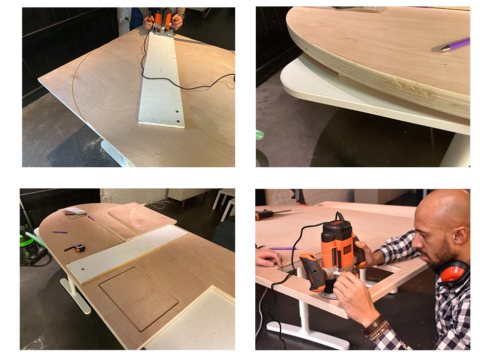 Then we moved on to the hole for the mixing desk. We measured it and decided where we wanted it to be placed in the table and again we used the router. We checked if the mixer fitted well, we had to go back with the router and take a bit more off the edges to make it perfect!”
