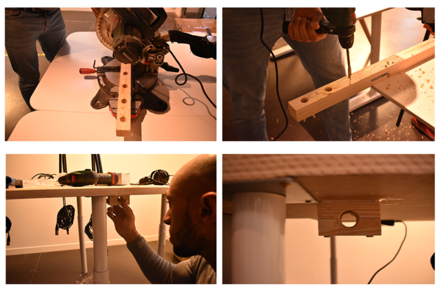 Thanks to the holes we drilled earlier, we then inserted our microphone arms and screwed them to the table.