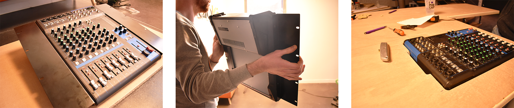 So this isn’t a new mixing desk, when we got it the metal mounts were included. We attached them upside down on both sides of the mixer so that they wouldn’t show once they were hung on the studio table. As you’ve probably understood, we then attached the metal mounts underneath the plywood table!