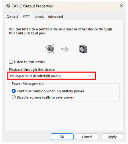 Under the Listen Tab check “Listen to this device”. You’ll see a dropdown menu> select your speaker or headphonesin the list.