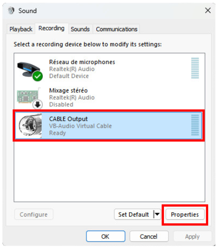By clicking on OK your preferences will be saved. However, as the audio is in a closed loop you won’t actually be able to hear it. To fix this, go back to the Recording Tab > Select your VAC >Properties.