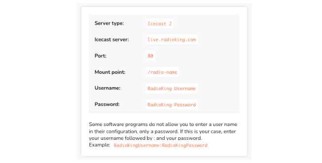 When it comes to configuring your RadioKing stream with any of the solutions mentioned above, the required information can be found under the Live tab of your Radio Manager. You’ll have access to your live connection information, it will look something like this: