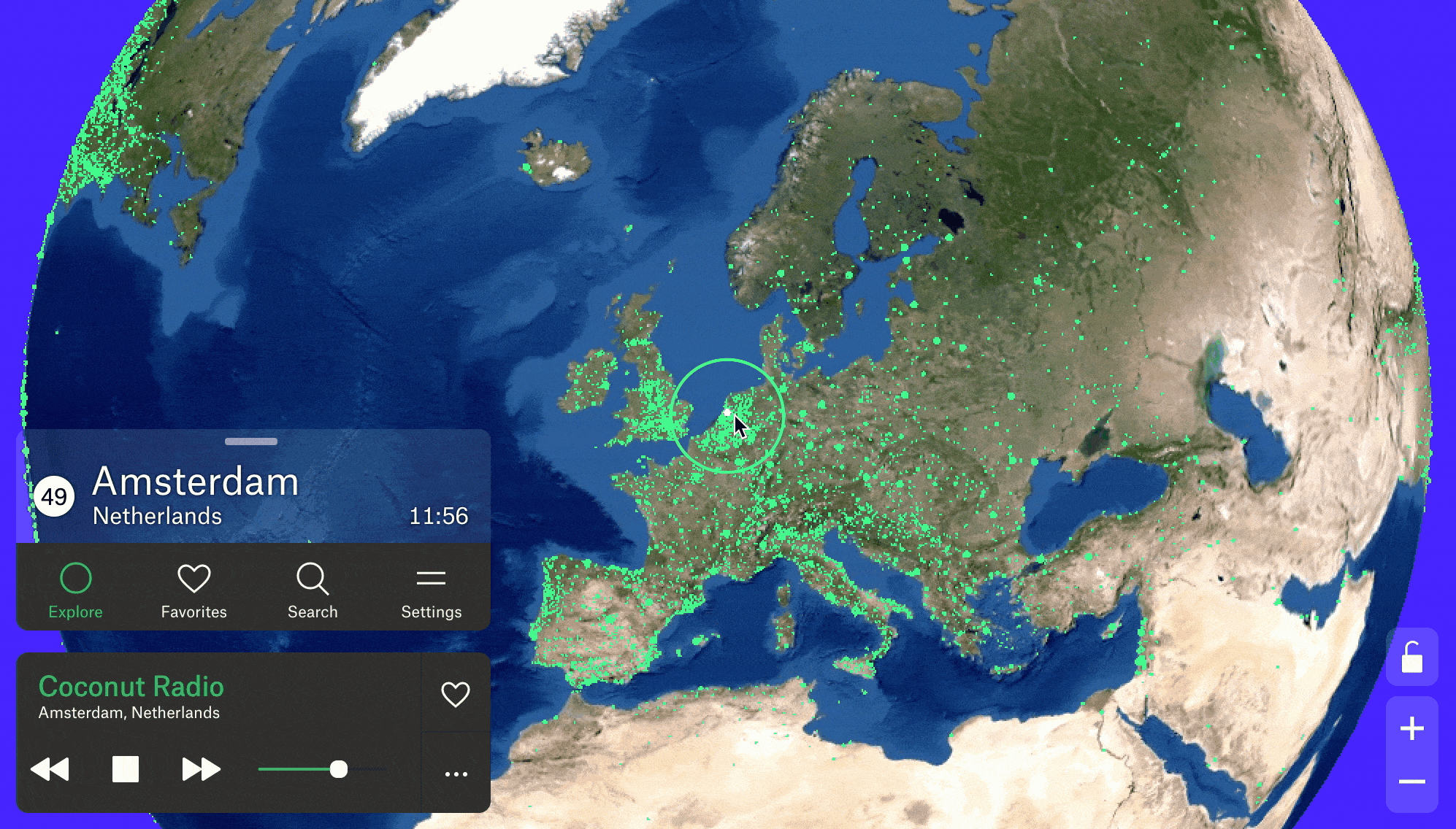 Radio Garden is a non-profit radio and digital research project. Conceived in Amsterdam, it offers a dynamic world map with thousands of radio stations organized by geolocation and grouped by city.